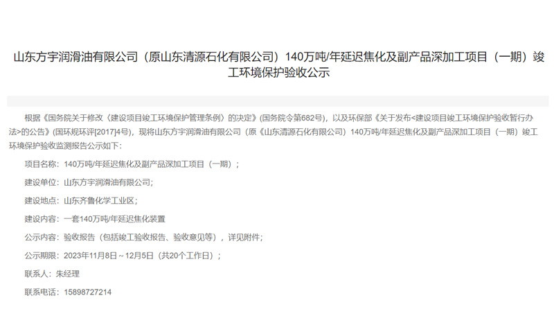 根據(jù)《國務院關于修改〈建設項目竣工環(huán)境保護管理條例〉的決定》(國務院令第682號),以及環(huán)保部《關于發(fā)布<建設項目竣工環(huán)境保護驗收暫行辦法>的公告》(國環(huán)規(guī)環(huán)評[2017]4號),現(xiàn)將山東方宇潤滑油